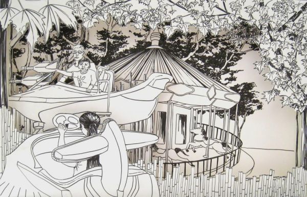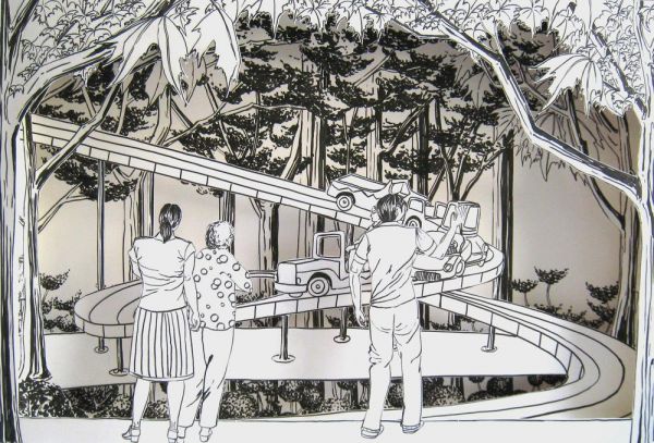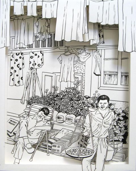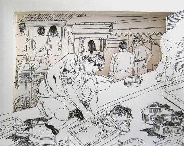 Die Zeichnungen führen den Betrachter mitten in den wuchernden Organismus Shanghai und ermöglichen private Einblicke in die letzten sozialen Biotope der Millionenstadt. Jenseits der glitzernden Fassaden von „Boomtown" führt „Megapolis" den Betrachter in die Garküchen und auf die Märkte der Stadtviertel, die den Bauplänen zum Opfer fallen werden. Die alten Gassenhäuser werden in wenigen Jahren ebenso verschwunden sein, wie die dort lebenden Straßenhändler. In den alten Vierteln findet Privates auf der Straße statt, ein Mittagsschlaf in der Öffentlichkeit ist ebenso alltäglich, wie Fitnesstraining im Park im Pyjama. „Megapolis" ist eine zeichnerische Spurensicherung volkstümlicher Enklaven, umgeben von Hochstraßen und Wolkenkratzern.