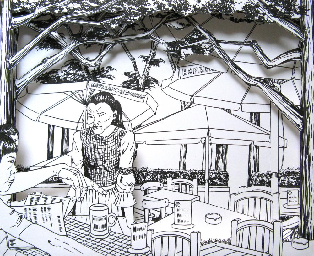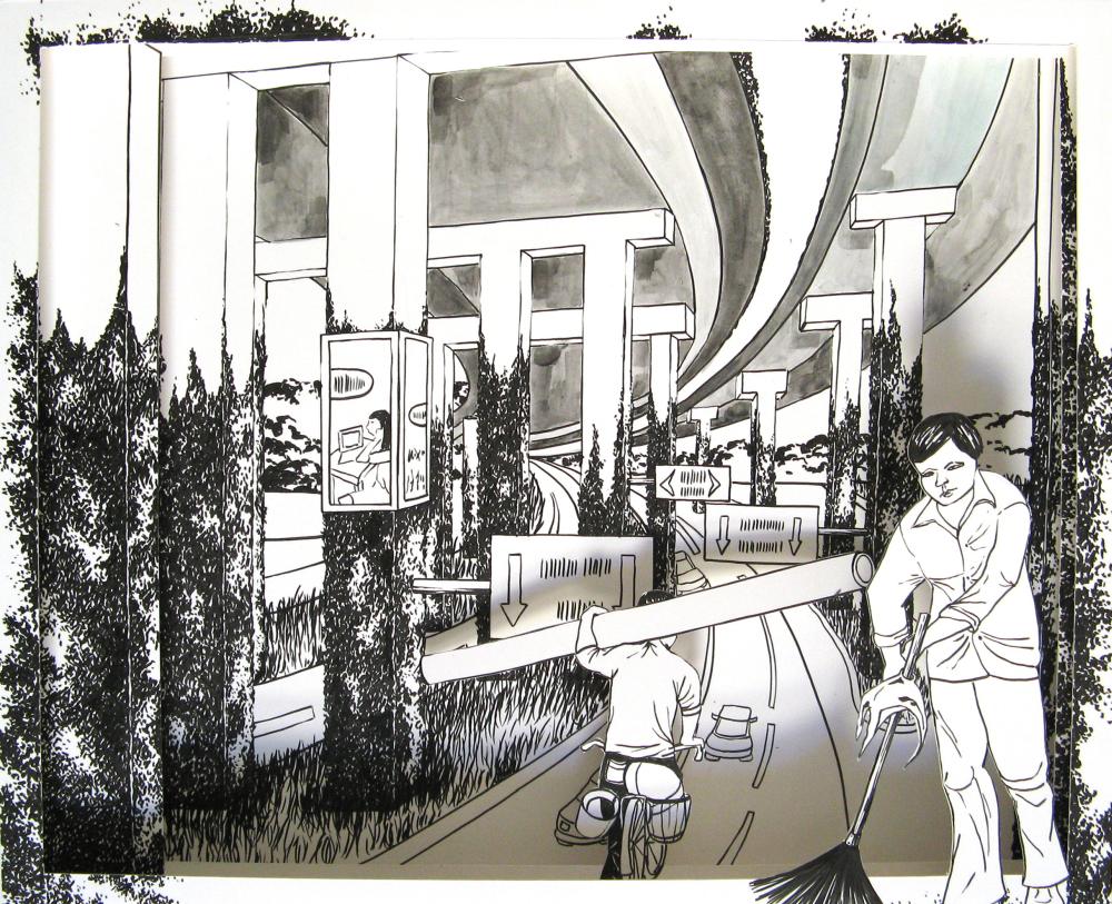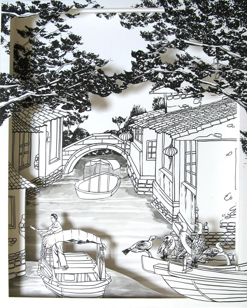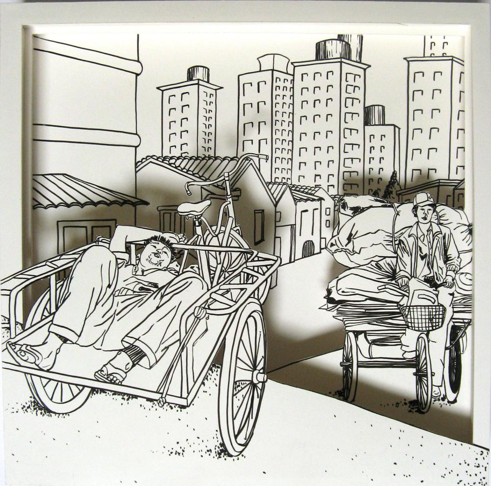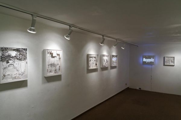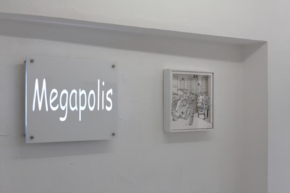 In der Serie „Megapolis" werden bei einer mehrwöchigen Shanghai-Reise entstandene Fotografie zeichnerisch umgesetzt und in Form von Pop-up-Darstellungen in die Dreidimensionalität überführt. Mehrere Schichten von Zeichnungen werden ausgeschnitten und in Objektkästen übereinandergelegt, so dass sich ein bühnenähnlicher Aufbau mit Durchblicken ergibt. Die Tusche als Zeichenmaterial schlägt eine Brücke zur Tradition der Tuschemalerei als klassisches künstlerisches Ausdrucksmittel in der chinesischen Kultur. Es entstehen fiktive Ansichten Shanghais auf der Grundlage realer Beobachtungen.