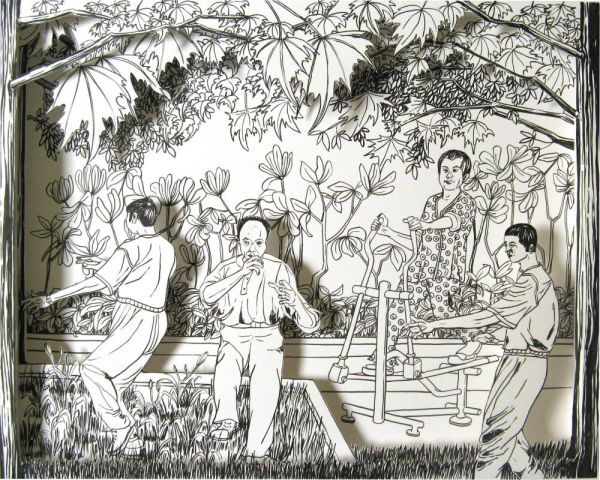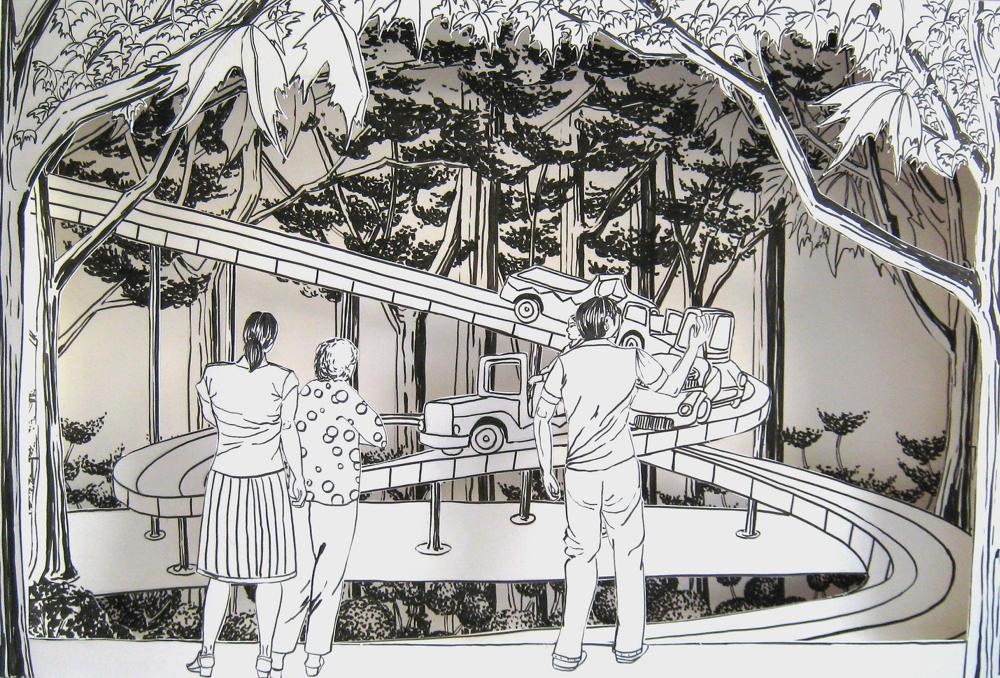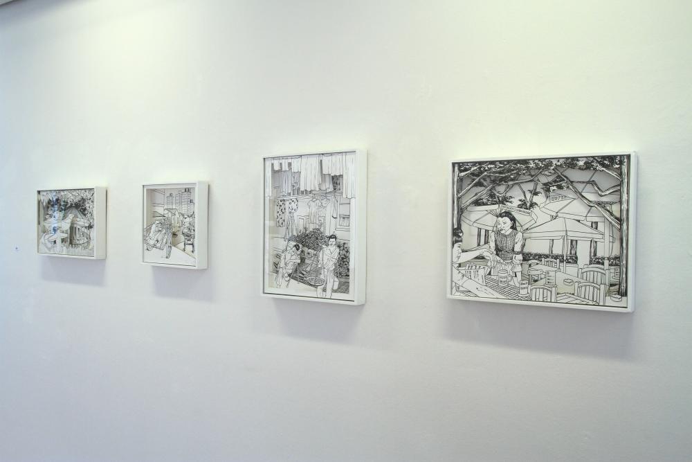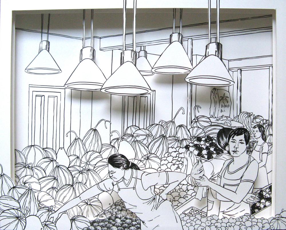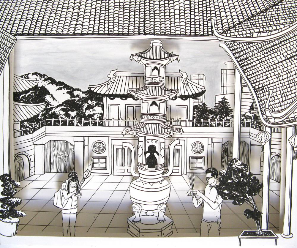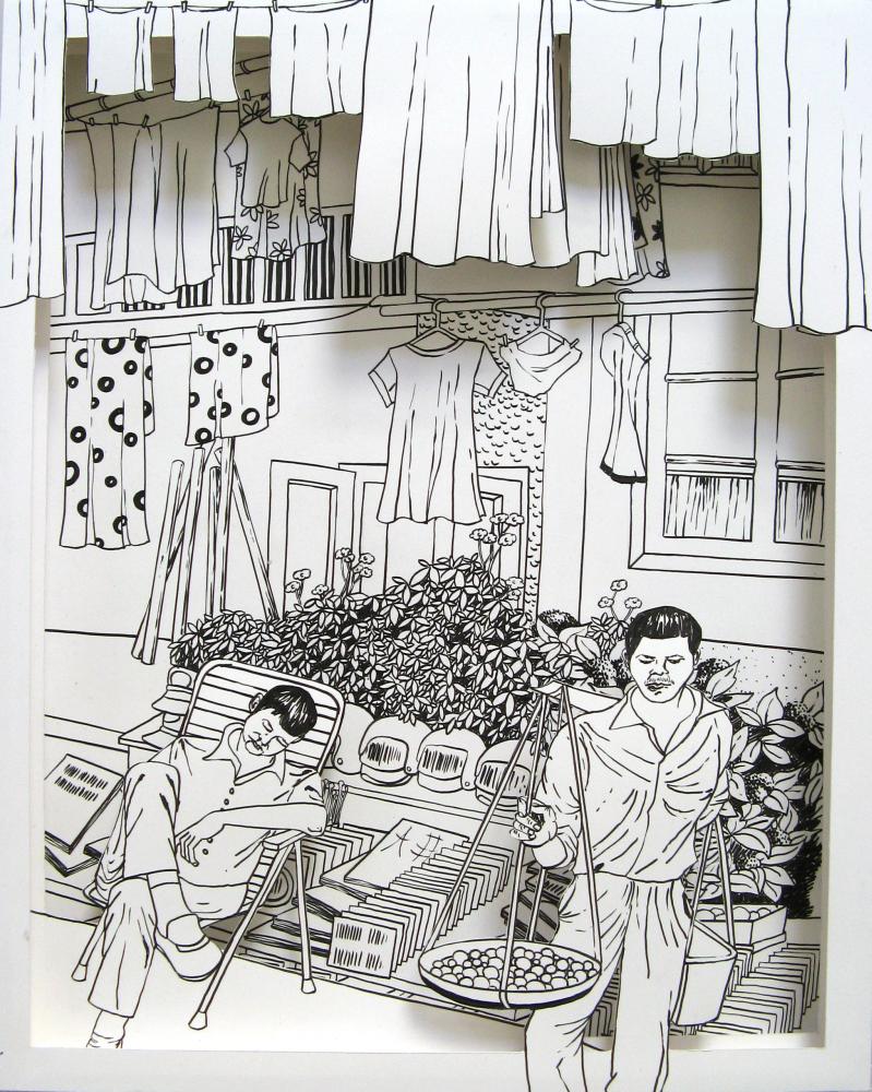 In der Serie „Megapolis" werden bei einer mehrwöchigen Shanghai-Reise entstandene Fotografie zeichnerisch umgesetzt und in Form von Pop-up-Darstellungen in die Dreidimensionalität überführt. Mehrere Schichten von Zeichnungen werden ausgeschnitten und in Objektkästen übereinandergelegt, so dass sich ein bühnenähnlicher Aufbau mit Durchblicken ergibt. Die Tusche als Zeichenmaterial schlägt eine Brücke zur Tradition der Tuschemalerei als klassisches künstlerisches Ausdrucksmittel in der chinesischen Kultur. Es entstehen fiktive Ansichten Shanghais auf der Grundlage realer Beobachtungen.